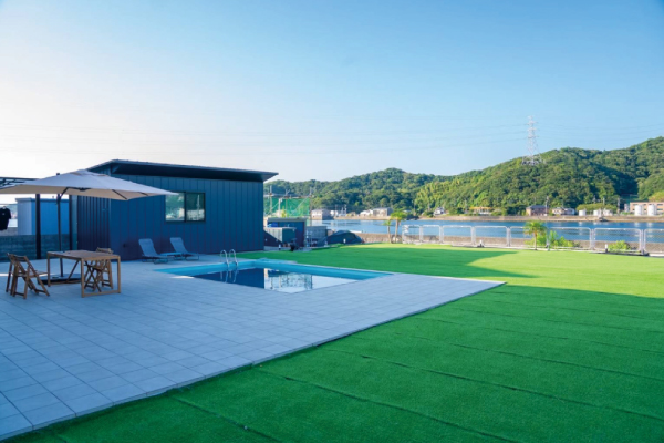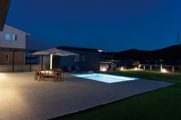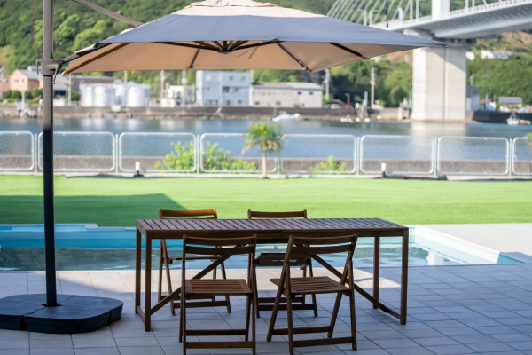 プールの向こうに広がるのは、雄大な橋と鳴門の海。 まるで、プールの水面がそのまま海へと続いているかのような、圧倒的な解放感がここにあります。 遮るもののない景色を眺めながら泳ぐ時間は、まさに非日常の体験。広大な芝生の庭が、その開放感をさらに高めます。 刻々と変わる空の色、海を渡る風、そして夜景に浮かび上がる橋のシルエット。鳴門ならではの絶景を、水辺の特等席からご堪能ください。